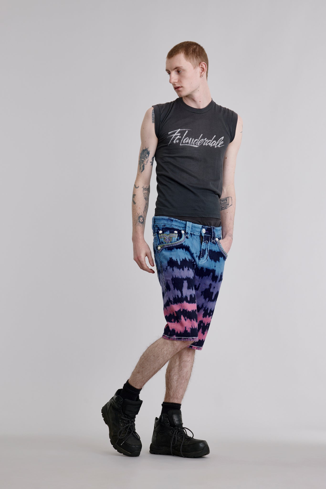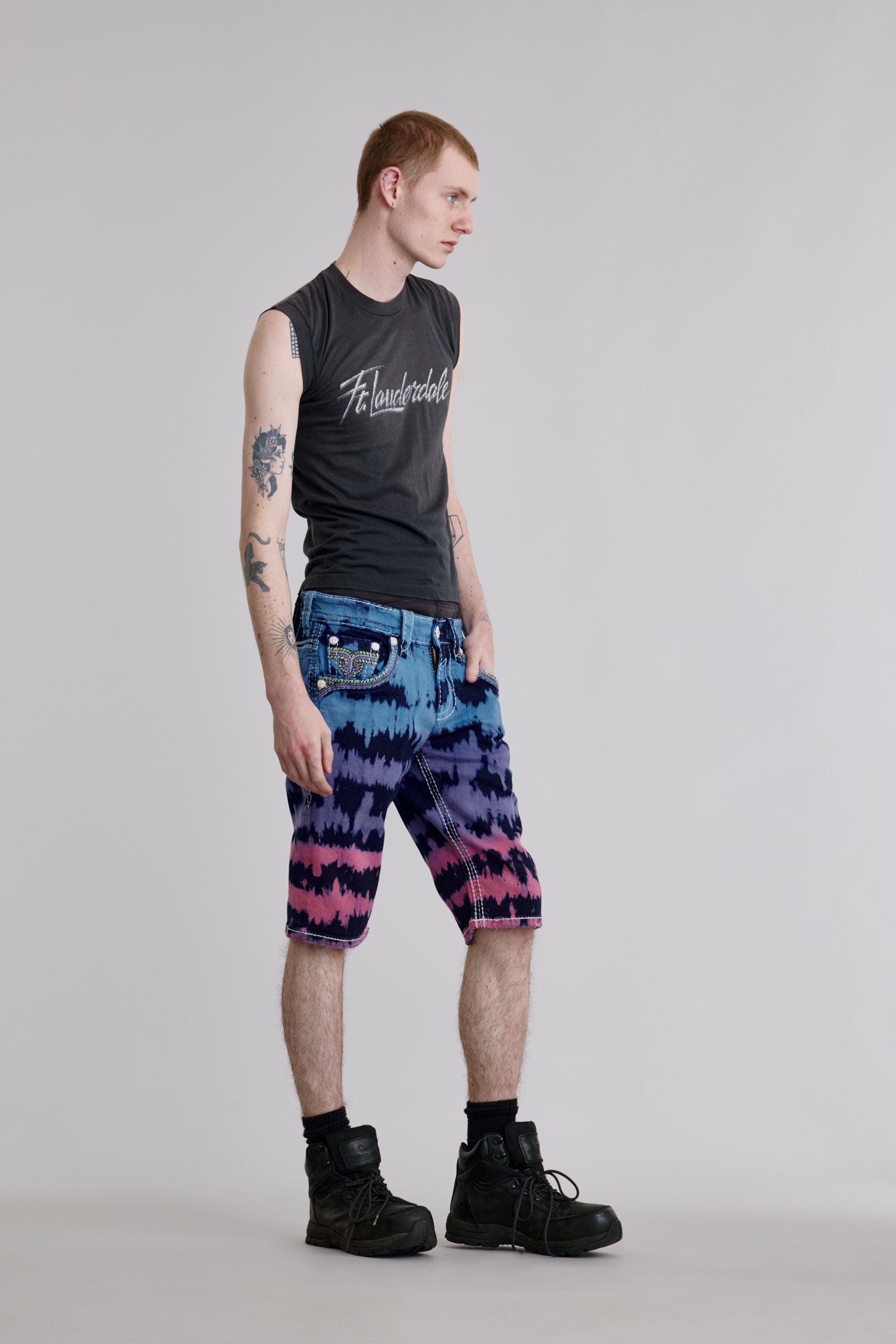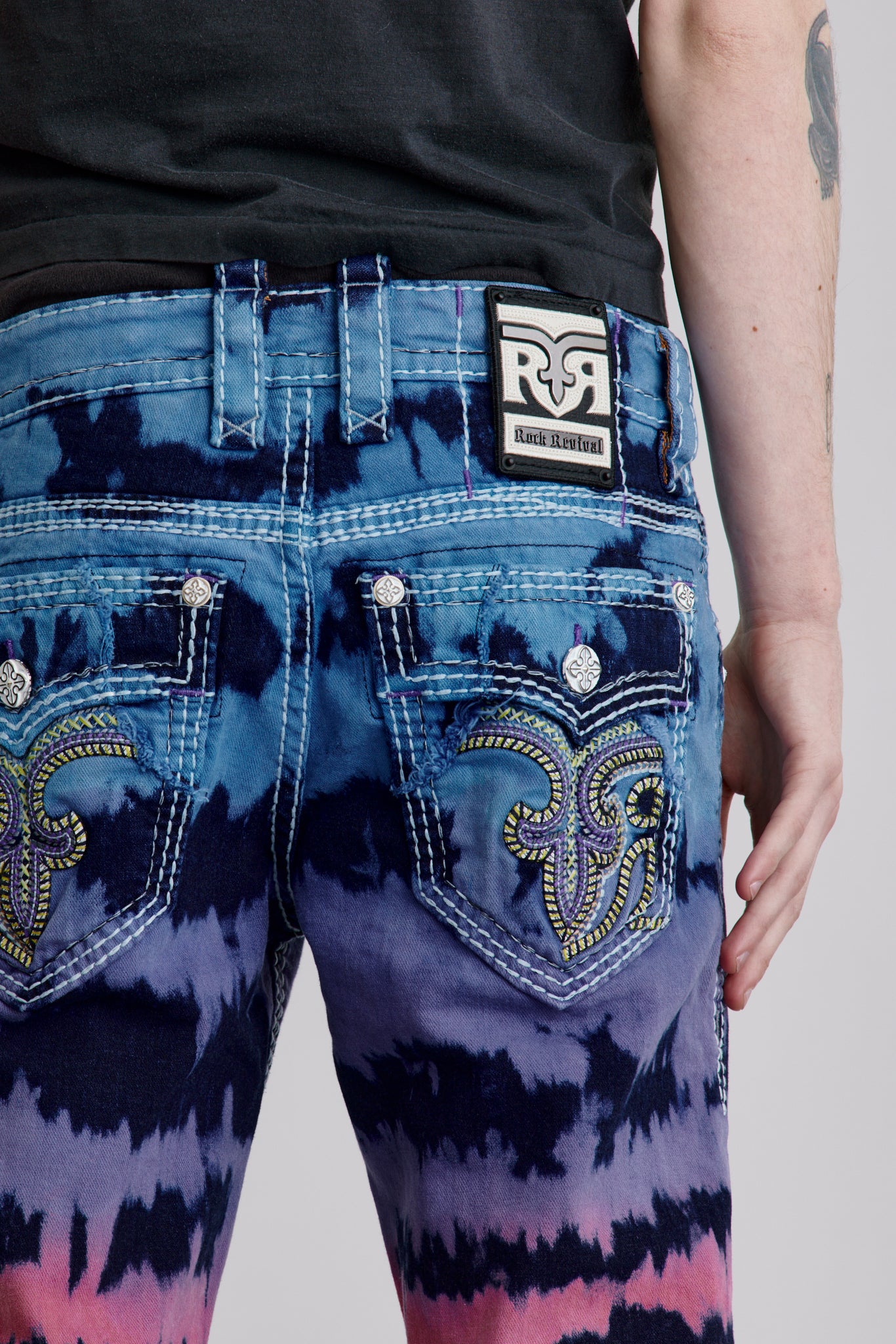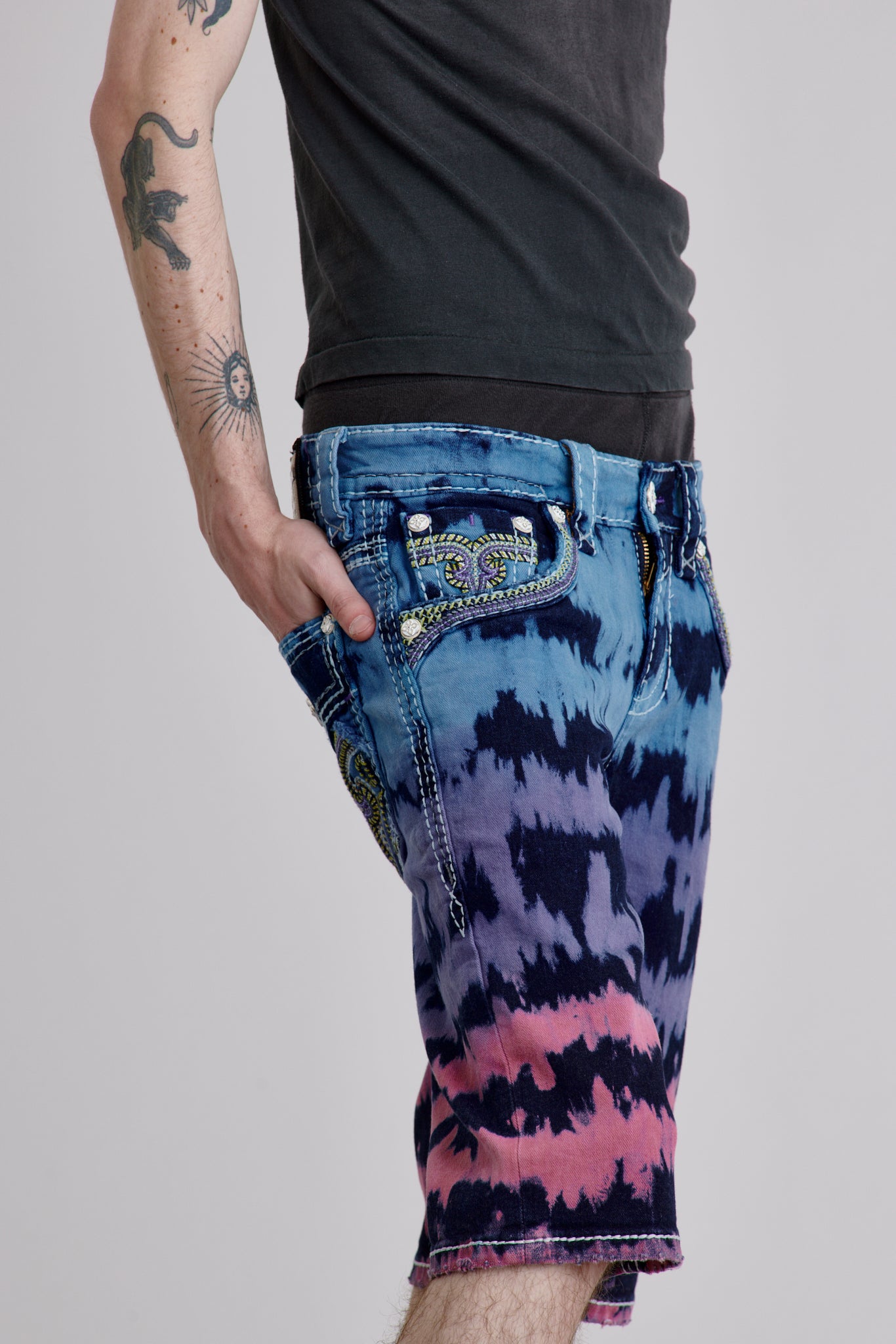 Armie Denim Shorts by Rock Revival feature a mid-rise, relaxed silhouette in a tie-dye wash, designed in Los Angeles.