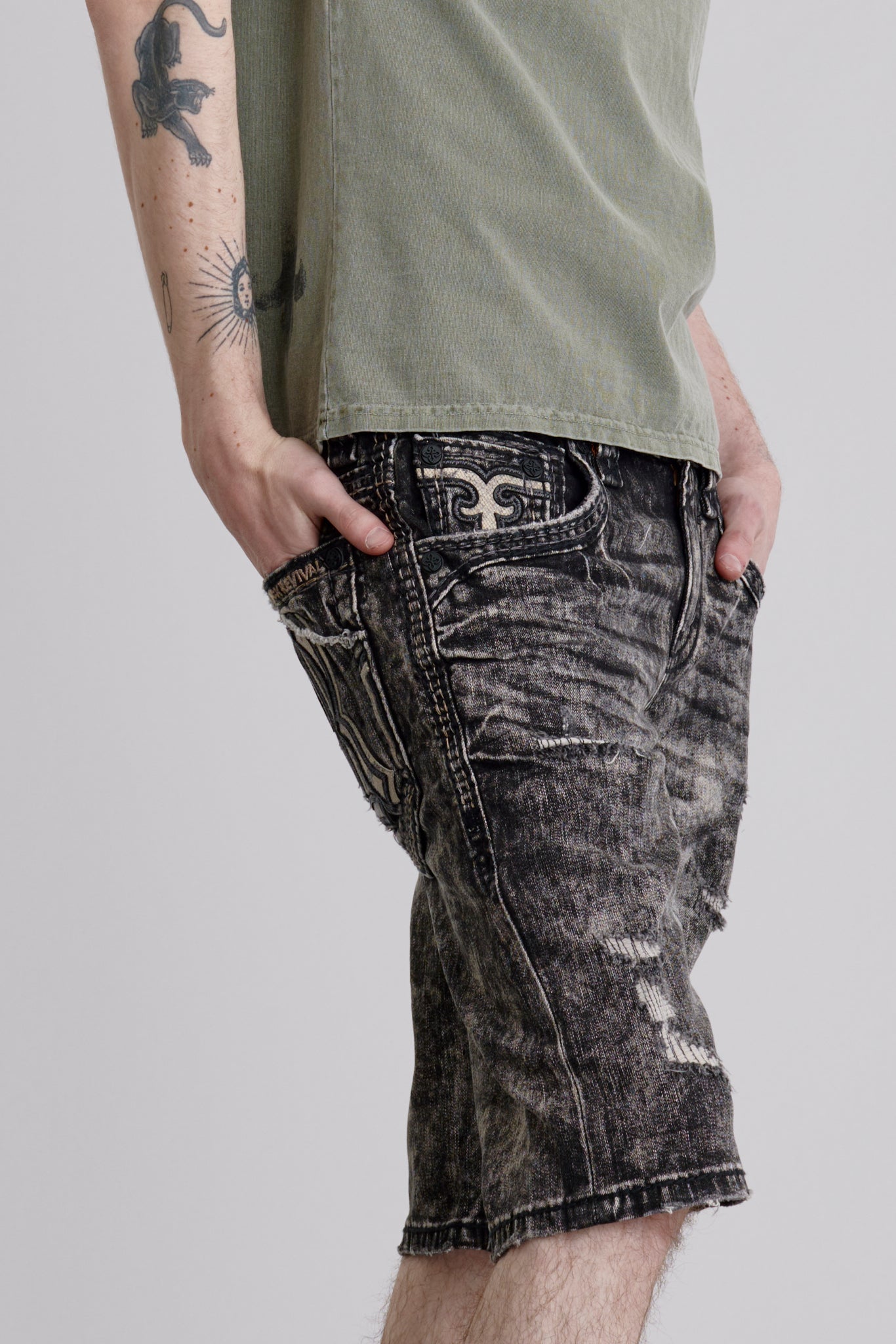 - ‘R’ initial snake-print patches embroidered on back pockets